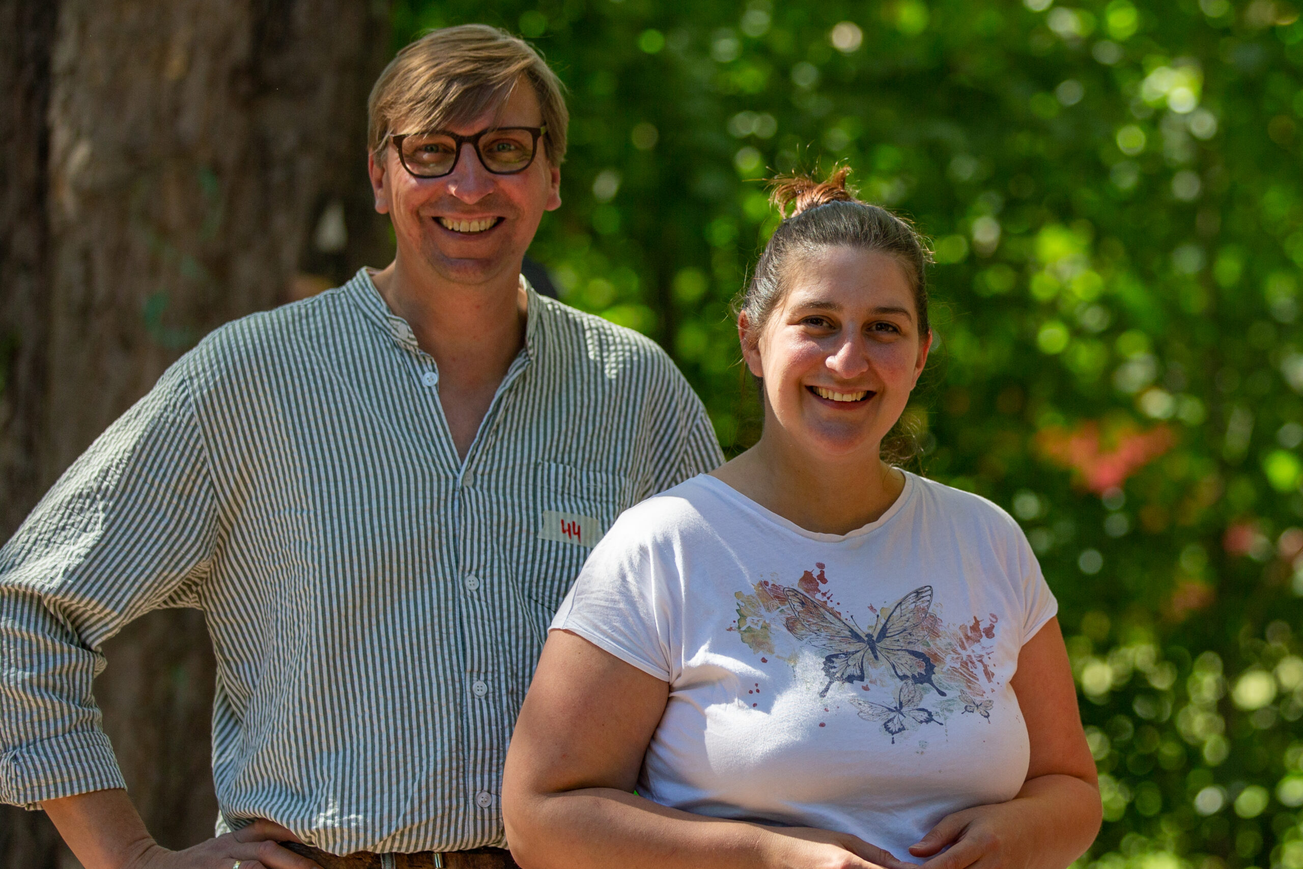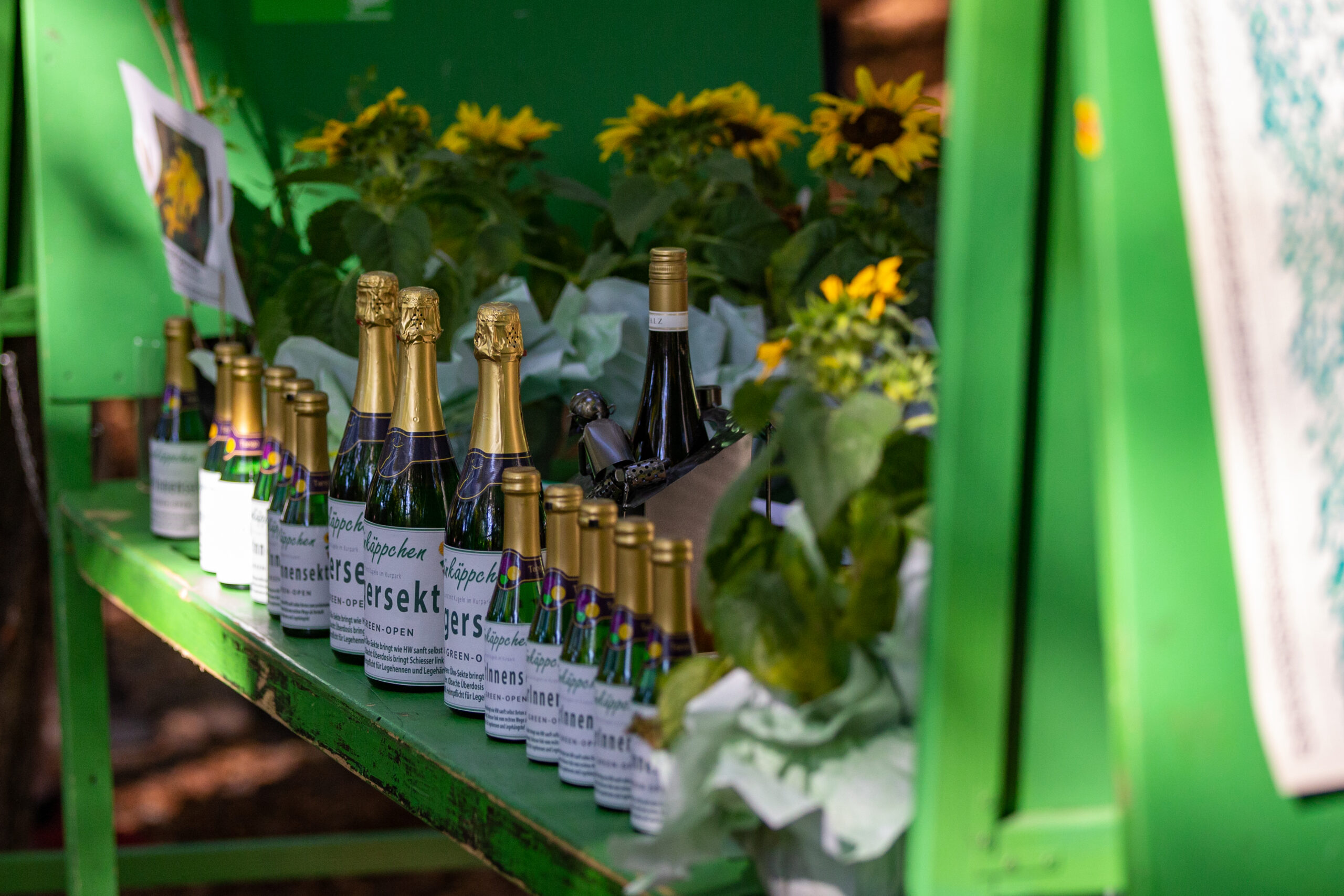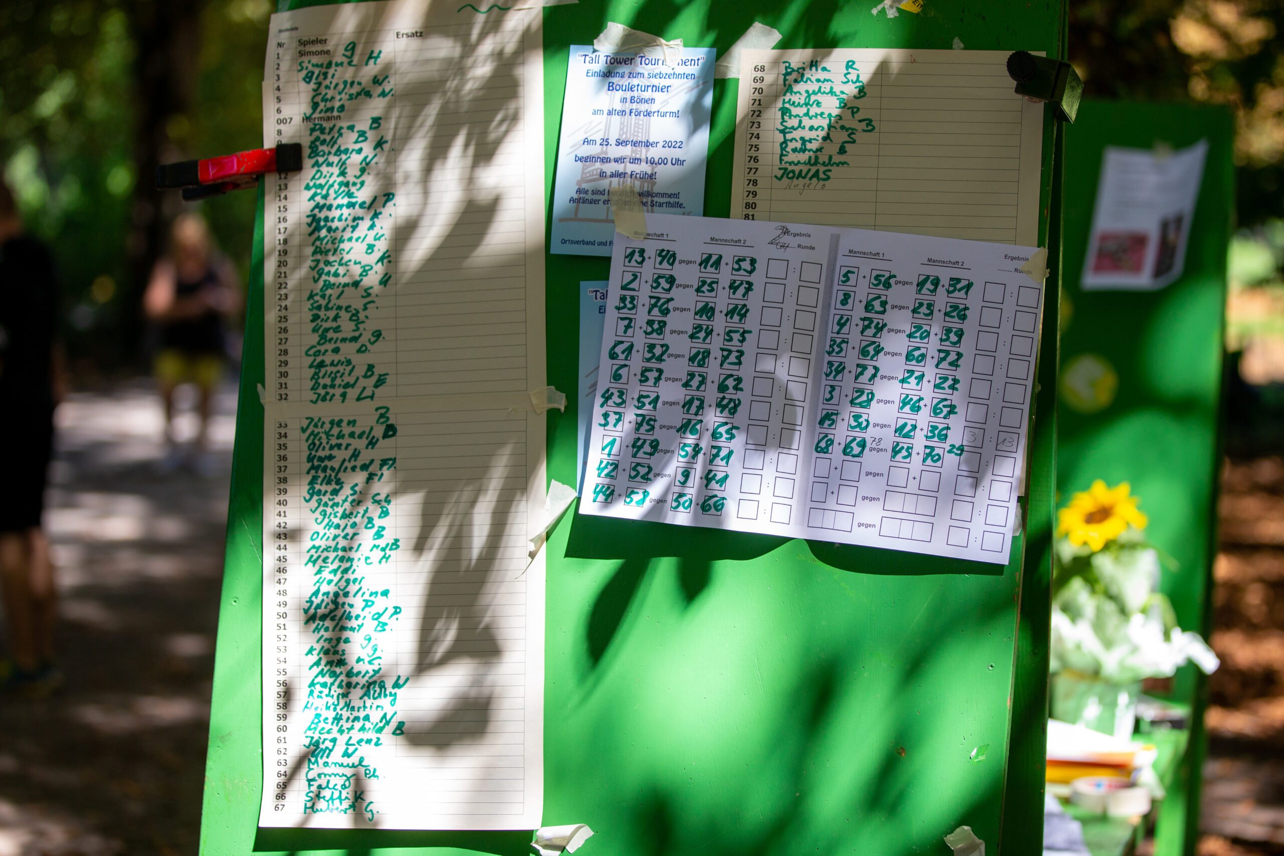 Beim ältesten Boule-Turnier der Region ging es aber nicht nur um Siege – oder gar um Geldpreise, wie bei immer mehr Boule-Turnieren. Bei den Green-Open gibt es seit immer gestaltete-T-Shirts, Ökosekt und Applaus für die Gewinner*innen. Der neugierig-freundliche Austausch auch jenseits des Kugelspiels macht den Charme aus. So bekam Jörg Lenz das Greenhorn-T-Shirt als bester Neueinsteiger des Jahres, sonderetikettierte Grünkäppchen-Öko-Pikkölöchen und Sonnenblumen wurden nicht nur an die vielen Helfer*innen verteilt.