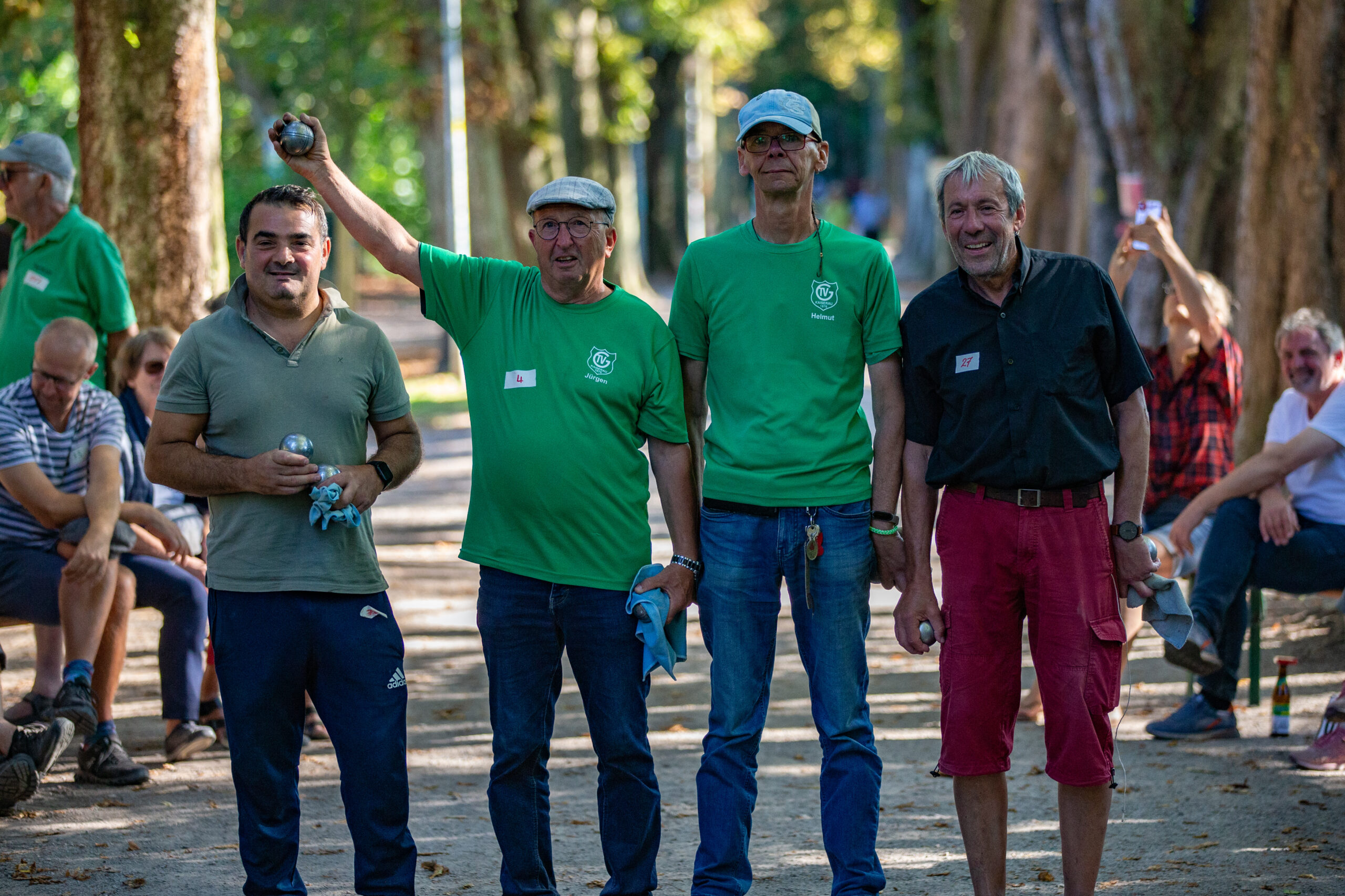 80 Mitspielende und nochmal gut 80 Zuschauer*innen belebten den Kurpark spielerisch entspannt bei den 31. Green-Open am Sonntag. Ab 10 Uhr rollten und flogen auf der Kastanienallee im Kurpark friedliche Eisenkugeln um die Wette. Boule-Ligaspieler und Anfänger wetteiferten 4 Vorrunden zufallsgelost. In Halbfinale und Finale traf in diesem Jahr Sonderklasse gegeneinander. Angelo Evangelio (Dortmund) und Bernd Göckendenns (Schwerte) gewannen dann frech-offensiv 13:8 gegen Helmut Bassin und Jürgen Weckentrop (zufällig beide TVG Kaiserau). Auch einige Spaziergänger, die vorbeikamen, blieben gespannt bis zum Schluß-Schuß gegen 18:30 Uhr.