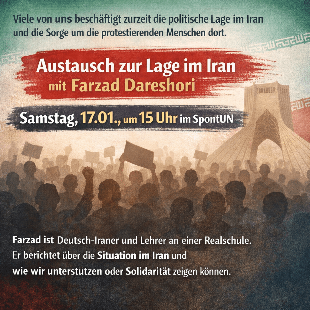 Viele beschäftigt zurzeit die politische Lage im Iran und die Sorge um die protestierenden Menschen dort. Wir haben kurzfristig Farzad Dareshori aus dem Ausschuss für Chancengerechtigkeit und Integration gewinnen können für einen Austausch morgen am Samstag, 17.01., um 15 Uhr im SpontUN. Farzad ist Deutsch-Iraner und Lehrer an einer Realschule. Er kann uns über die Situation im Iran berichten und vielleicht ja auch über Möglichkeiten, zu unterstützen oder Solidarität zu zeigen.
