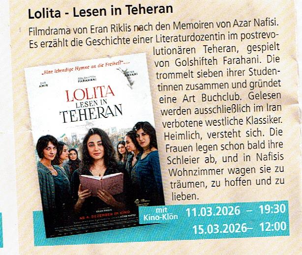 Filmdrama nach den Memoiren von Azar Nafise. Im postrevolutionären Teheran treffen sich Studentinnen um schsschließlich verbotene westliche Klassiker zu lesen. Heimlich versteht sich. Die Frauen legen ihre Schleier ab und in Nafisis Wohnzimmer wagen sie zu träumen, zu hoffen und zu lieben.